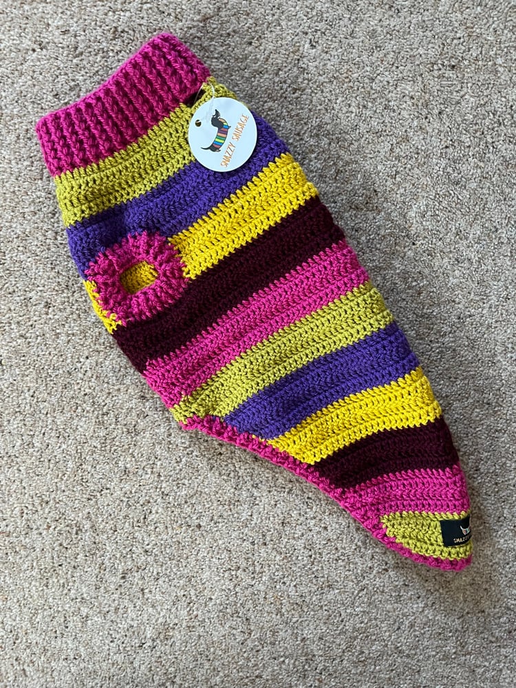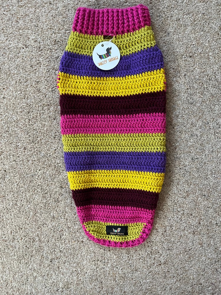 If you want your dachshund to stand out in the crowd this is the jumper for you! Wide striped jumper in vivid colours. Machine washable at 30 degrees and cool tumble dry.