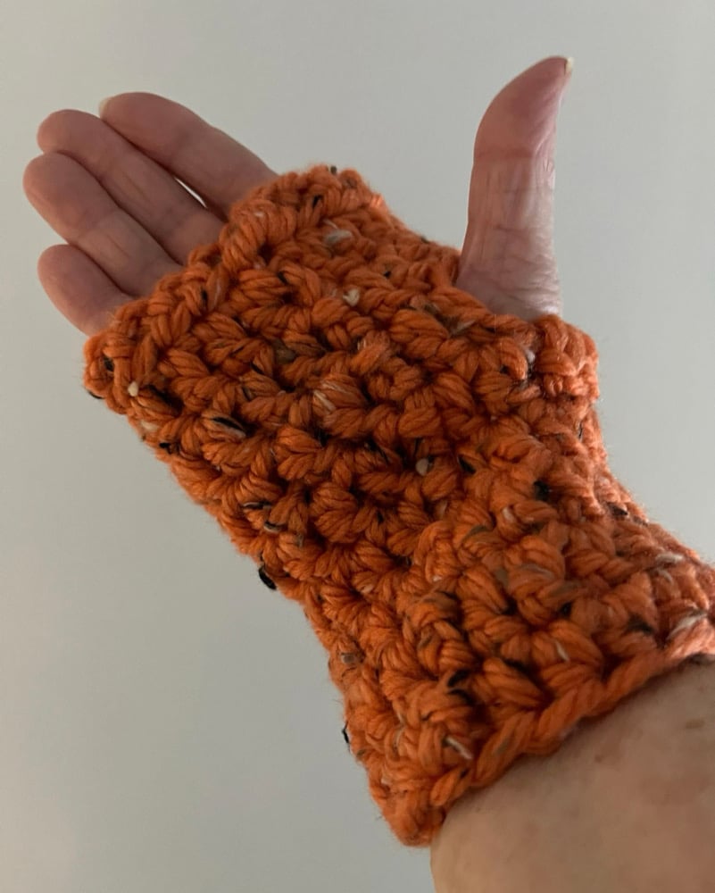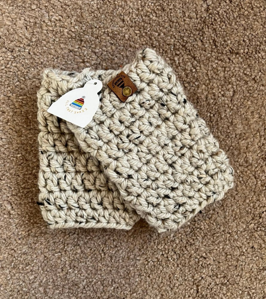 Gorgeously soft fingerless mittens. Made from super chunky yarn and finished off with faux leather logo tag.